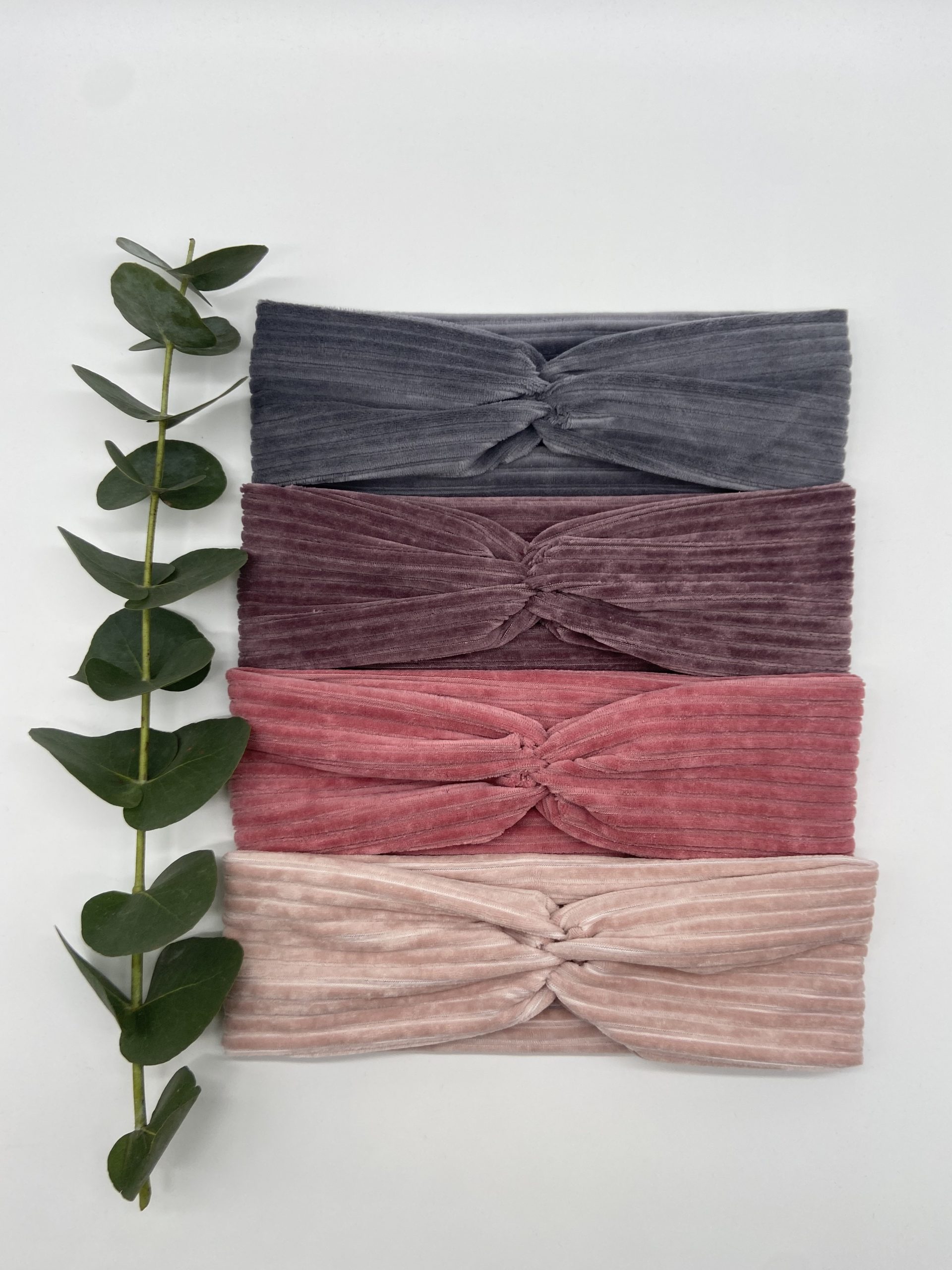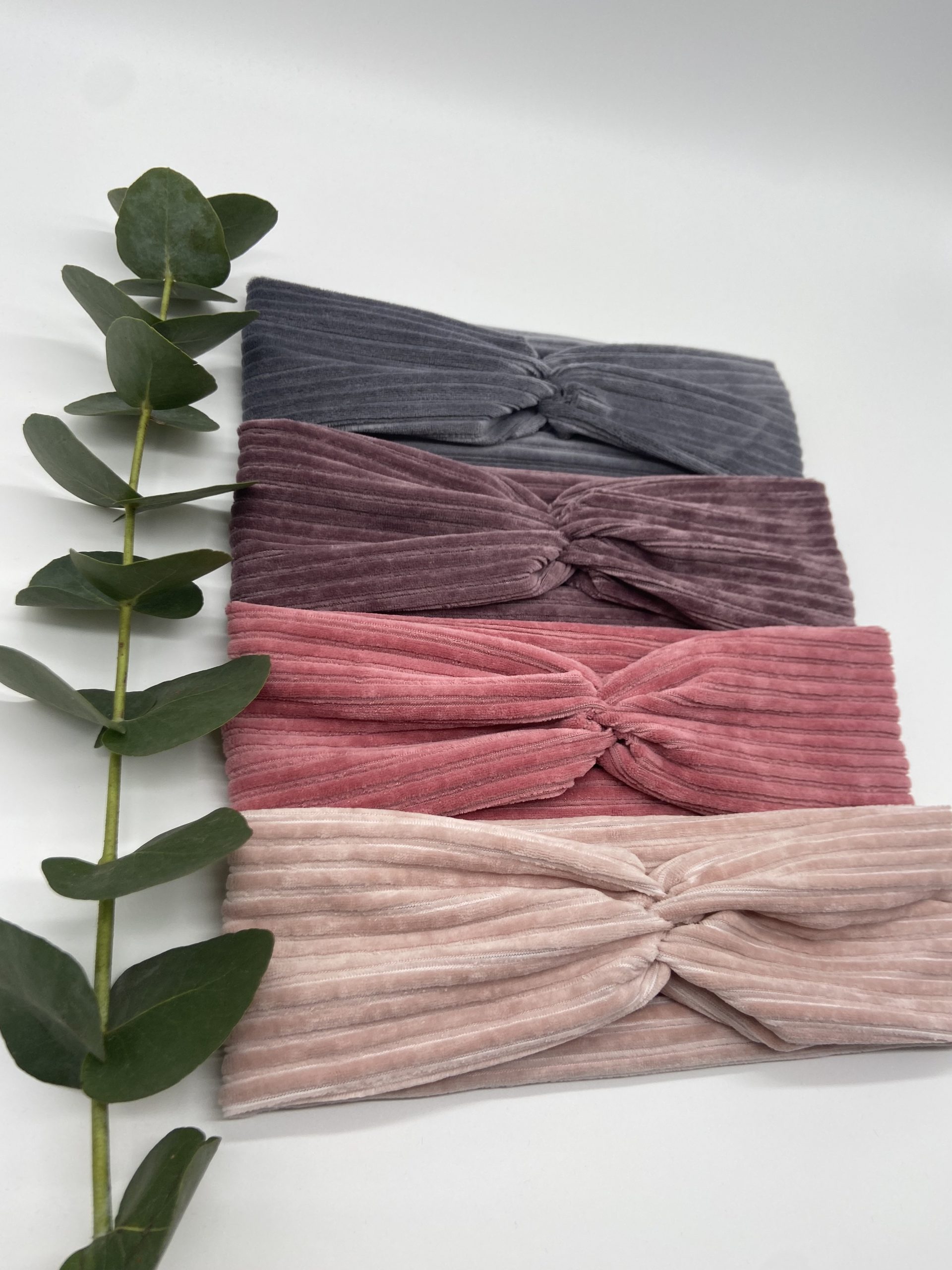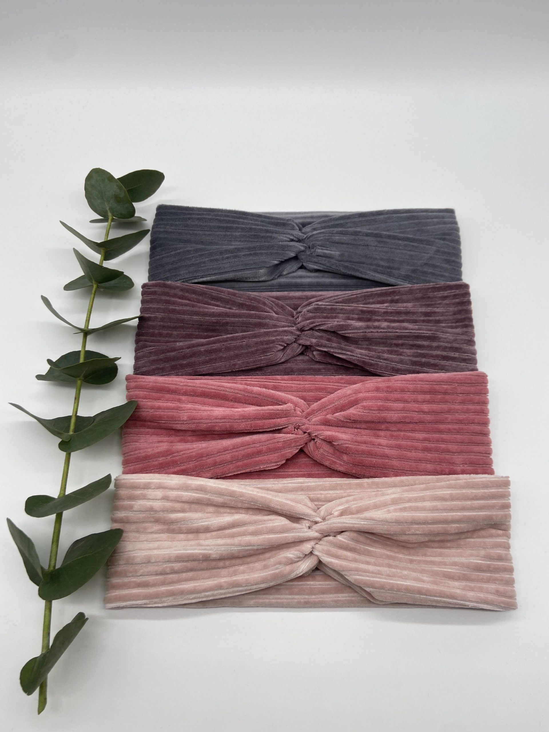 Haarband aus Cord in Anthrazit, Lila, Altrosa und Rosa